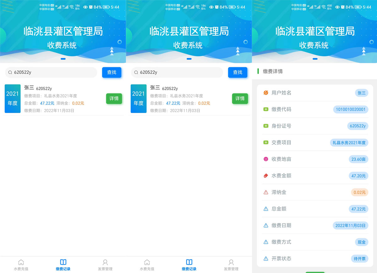 灌區(qū)收費系統(tǒng)運用計算機應用技術以及相關的專用分析軟件和通訊網(wǎng)絡所組成的一個綜合性的收費系統(tǒng)。通過對流經(jīng)用水戶的灌溉 時間以及流量的輸入,計算出該用水戶的水費,生成收費賬單提交至上級審核 ,審核通過即可在線繳費以及他人代繳功能。管理單位可以在手機和電腦網(wǎng)頁上同步查詢相應的用水量以及繳費情況。